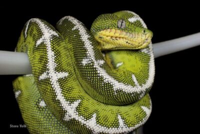 These snakes are native to the northern part of the Amazon Basin in South America. That white stripe down the emerald boa’s back? It helps break up the body shape in the canopy. That camouflage has a purpose. This snake isn’t just pretty. It’s effective. They’re not venomous, but they don’t need to be. They hang from branches, all coiled up, waiting to strike birds, rats, bats, other snakes, frogs… they don’t care. They’ll shoot out the full length of their body and grab whatever’s passing.