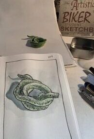 Emeral Boa Constrictor miniature from the Houston Zoo and an ink and watercolor wash sketch