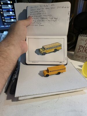 This morning’s Random Object from the Randomogrifier was a school bus. A bus seems simple, just a rectangle in perspective, but as always, the minute you say “this will be easy,” it turns into a challenge.