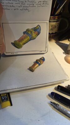 Today’s pull from the Random Object Randomogrifier was a mummy case, not a sarcophagus. I had that backward at first. A sarcophagus is the big outer stone coffin, the one everyone pictures with the gold mask and the hieroglyphs. The mummy case is the body-shaped shell that actually holds the wrapped person. It fits tight, like a second skin, and then that case is placed inside the coffin or the sarcophagus. It’s a nesting doll of protection and ritual.