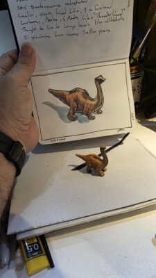 While I was sketching, we talked about how Brontosaurus lived about 150 million years ago in the Late Jurassic, right as Pangaea was splitting apart. That’s why their fossils are found only in North America. The landmasses separated, and the animals on each side evolved differently. That separation gave us Brontosaurus here and other sauropods elsewhere.