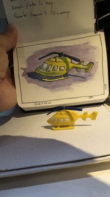 I pulled a helicopter from the Random Object Randomogrifier and laughed at the bent blades. The toy is beat up from living in the canisters, which makes it perfect. The whole point here is to draw what I see, not what I expect to see. When I fight that impulse, the drawing looks more like the real thing and less like a guess.